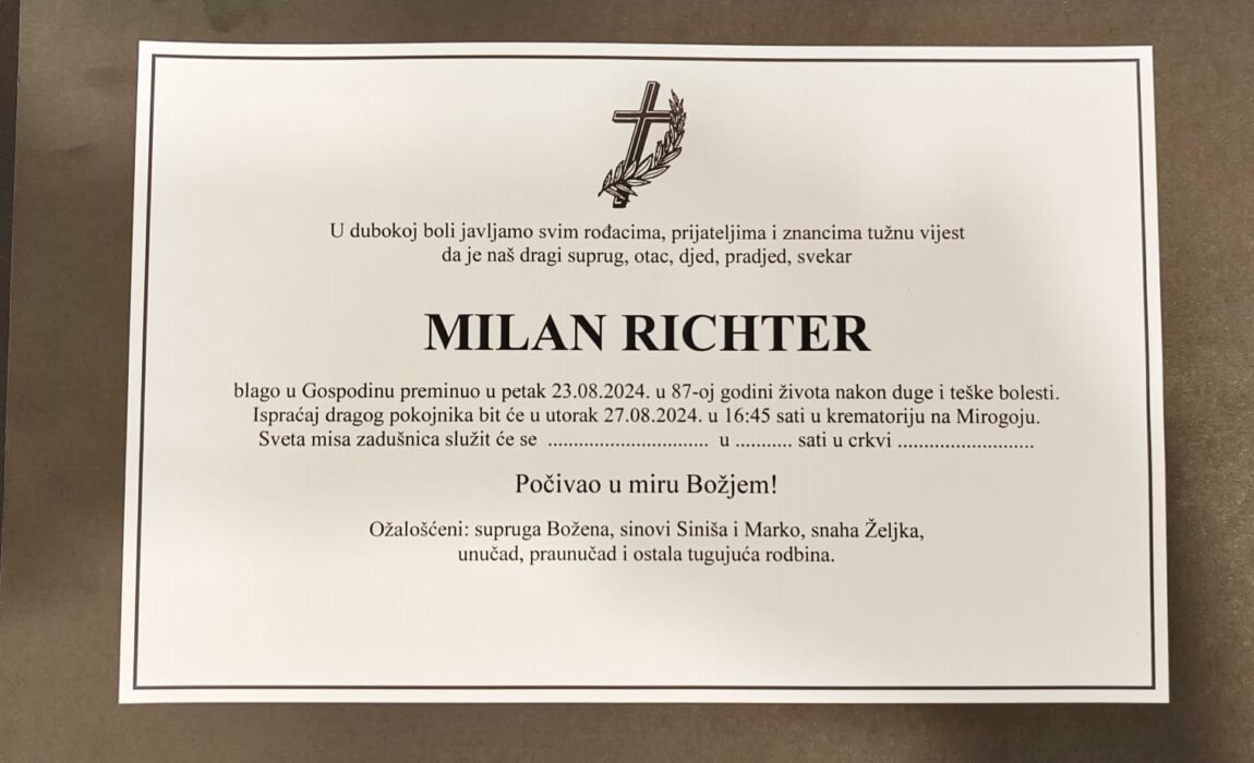 Posljednji ispraćaj Milana Richtera bit će u utorak, 27. kolovoza 2024. godine u 16.45 sati u krematoriju na Mirogoju.